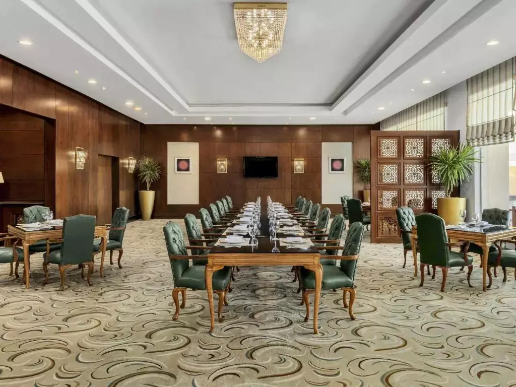 Rixos Radamis в районе Набк (Шарм-эль-Шейх) — новинка 2025 года с самым современным конгресс-центром в регионе (общая площадь 4000 м²). Главный зал Diamond Hall (1800 м²) вмещает 1000 человек в театральной расстановке или делится на секции для параллельных сессий. Дополнительно: 7 breakout-комнат по 50–100 м², кинотеатр с Dolby Atmos и просторное фойе с террасой для кофе-брейков и выставок. Оснащение: беспроводные микрофоны, LED-экраны, профессиональный свет, симультанный перевод. Территория 250 тыс. м² включает 11 бассейнов, приватный пляж длиной 700 м, спа Royal Spa и аквапарк для тимбилдинга (дайвинг, йога на пляже). Питание — 12 ресторанов, включая азиатский и итальянский для гала-ужинов.